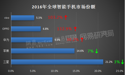 图1 2016年全球智能手机销量排名前五 (数据来源:IDC 制图:网易研究局)