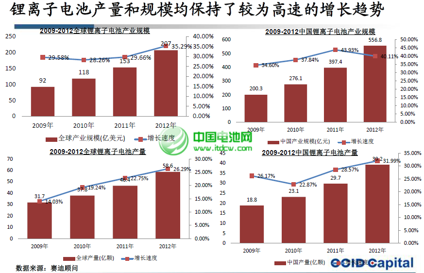 赛迪顾问数据显示,2012年全球锂电池行业仍实现高速增长,全球市场规模达到207亿美元,增长35.29%;中国市场产业规模达到556.8亿元,增长40.11%;2012年全球锂电池产量实现58.6亿颗,增长26.29%;中国锂电池产量实现39.2亿颗,增长31.99%。