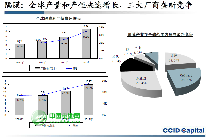 数据显示,高端电池隔膜技术仍掌握在日美韩等极少数国家企业手里,日本东燃化学、旭化成、宇部、韩国SK和美国Celgard五家企业占据了全球市场份额的87%。2012年全球锂电池隔膜产量达到6.54亿平方米,比2011年增长34.3%;2102年全球锂电池隔膜产值达到15.97亿美元,比2011年增长27.2%。