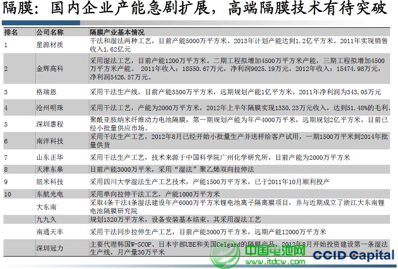 但整体分析来看,中国国内隔膜企业产能急剧扩展,但高端隔膜技术有待突破。低水平重复建设严重。中国电池网-中国电池杂志认为,2013年锂电池隔膜市场将面临严酷的市场竞争,缺技术、少品牌、短资金者将被淘汰出局,尤其是中小企业境地不容乐观。市场特征将呈现强者恒强、弱者出局的趋势。