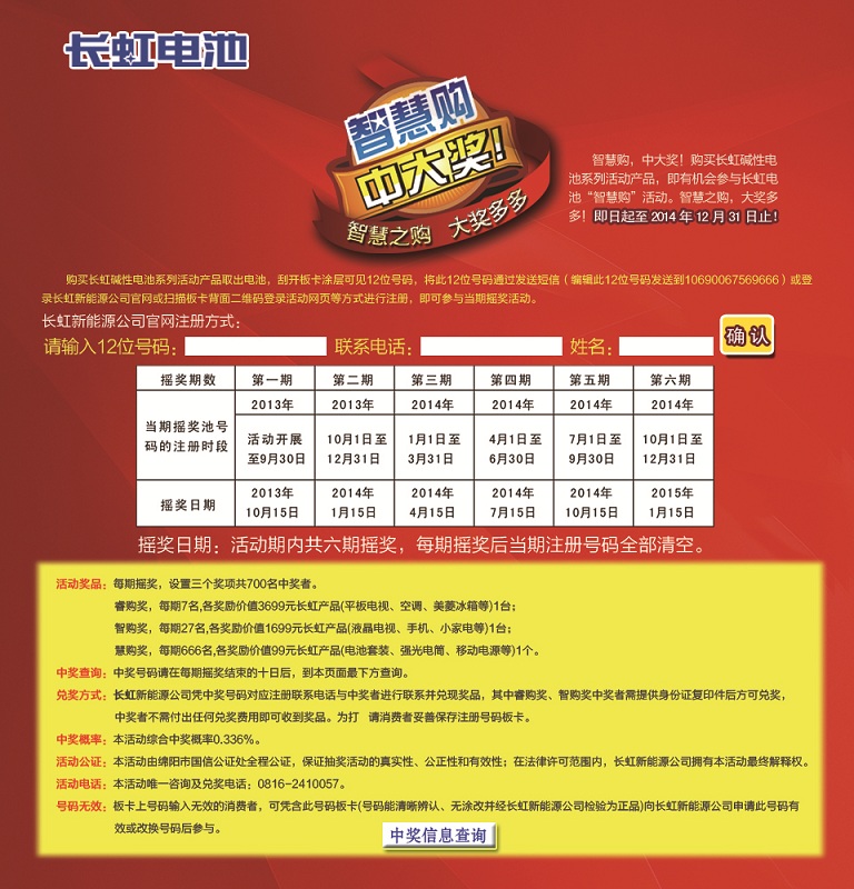 4月1日,长虹新能源公司面向消费者推出的高中奖率活动:长虹电池“智慧购”扬帆启航了。本活动参与方式简单,中奖者不需要付出任何兑奖费就可收到奖品,活动的结束时间为2014年12月31日