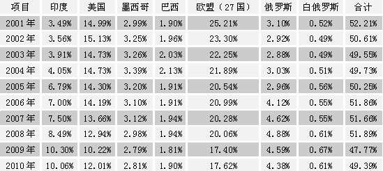 2001年-2010年有关国家或地区石墨电极需求全球市场比例