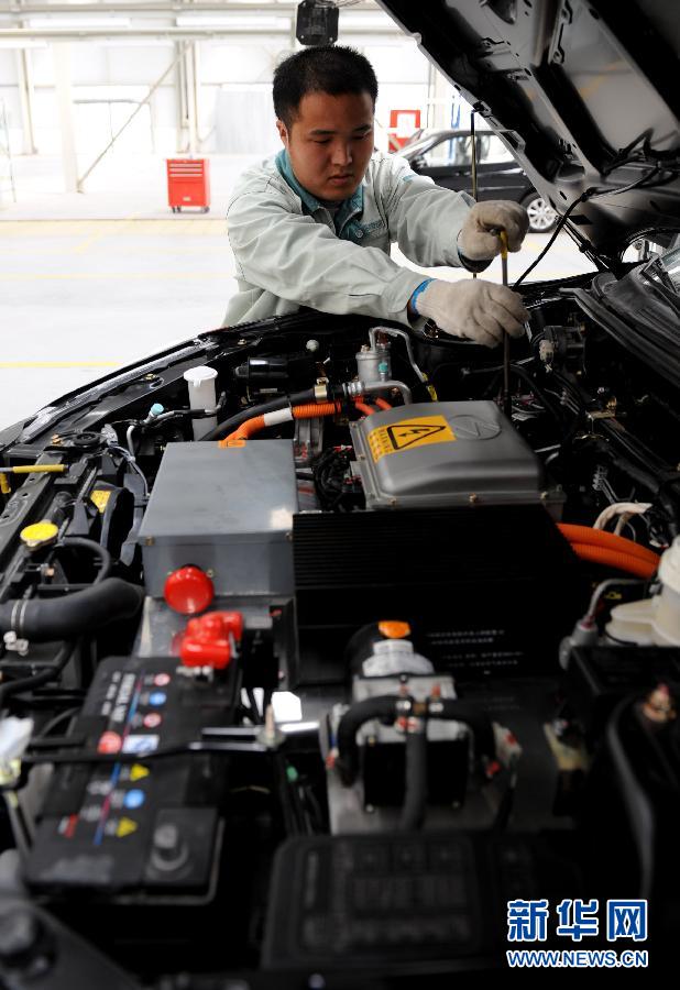 新乡 市新能电动汽车有限公司的工作人员在电动汽车生产流水线上安装电动机组(4月16日摄)。 近年来,随着油价上涨和环保要求的提高,新能源汽车越来越受到市场的青睐。结合新能源汽车