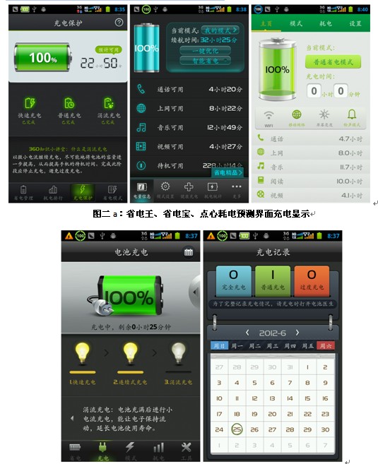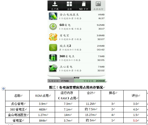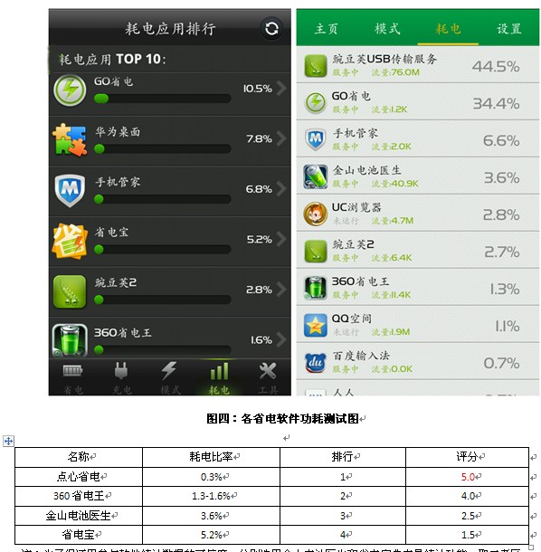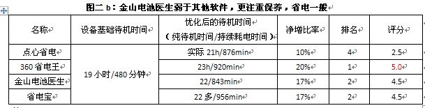 注:为了保证用参与软件统计数据的可信度,分别选用金山电池医生和省电宝典电量统计功能,取二者区间作为比较依据。