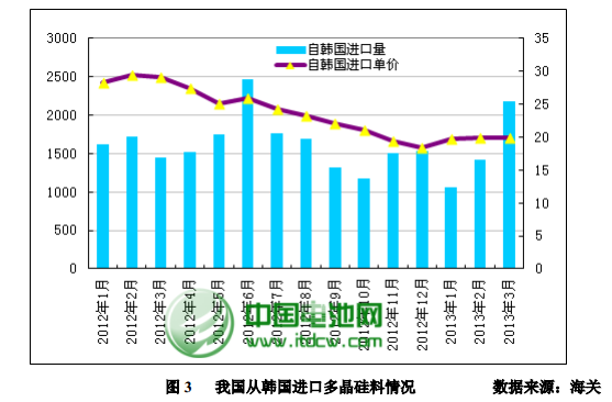 2013 年 3 月份从韩国进口多晶硅量增至 2184 吨,环比大幅上涨 53.6%;进口单价微幅回升至 19.88 美元/千克,环比增幅为 0.05%。2013 年 3 月自韩国进口单价延续 2 月涨势继续缓步回升。