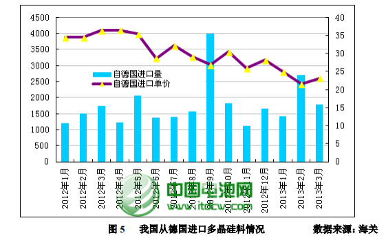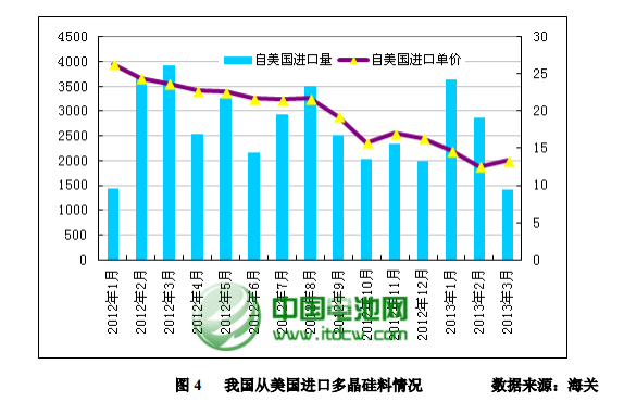 据最新海关统计数据显示,2013 年 3 月我国多晶硅进口量为6433 吨,环比下滑 19.49%,同比大幅下滑 15.93%;进口单价方面,3 月份多晶硅进口均价较 2 月有所反弹,亦是 2013 年以来首次回升,为 19.39 美元/千克,环比增长 9.55%,同比下降 31%,较 2012 年全年均价下滑 23.5%。