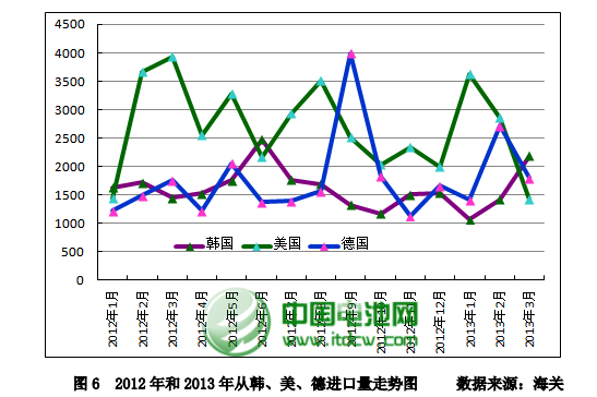 据 3 月份分国别进口数据显示,韩国、美国和德国是三家最大的进口国家,自韩国、美国、德国进口量占总进口量的 83.67%。其中从韩国进口量为 2184 吨,占总进口量的 33.95%,是除 2012 年 1 月和 6 月外进口量又一次超过美国和德国,位居榜首;从美国进口量为 1410 吨,占总进口量的 21.91%;德国进口量为 1789吨,占总进口量的 27.8%;其他地区进口量为 1051 吨,仅占总量的 16.3%。从进口单价来看,韩国 19.88 美元/千克、美国 13.34 美元/千克、德国 23.16 美元/千克。