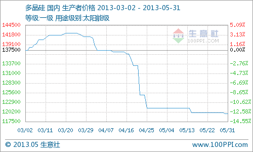 本月多晶硅市场价格小幅下调,主要原因有以下几个方面:(一)由于市场价格长时间低位徘徊,个别厂家出现与成本倒挂现象,商家的信心受到影响,多个复产计划也都被搁浅;(二)上游价格稳定,多晶硅成本短期内难以下降;(三)下游光伏在欧盟“双反”的压力下艰难生存,5月发布的47%的高额关税使中国光伏在海外市场失去竞争力。(四)下游需求的低迷一直蔓延到上游,国内开工率很低,库存居高不下。