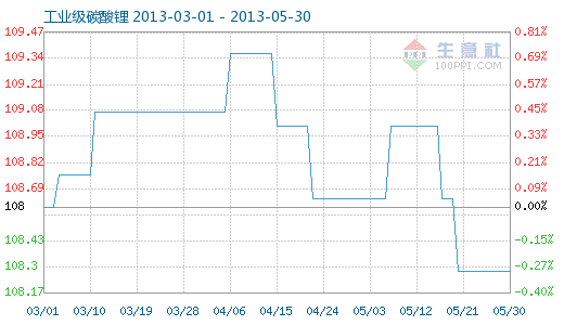 5月30日工业级碳酸锂商品指数为108.28,与昨日持平,较周期内最高点112.10点(2012-11-04)下降了3.41%,较2012年01月05日最低点98.94点上涨了9.44%。(注:周期指2011-09-01至今)