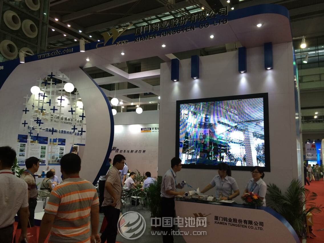 中国电池杂志-中国电池网(微号:mybattery)6月19日讯(肖何 梁小婧 丁丁 深圳报道)18日上午,由中国化学与物理电源行业协会主办的第十一届中国国际电池技术交流会/展览会(CIBF 2014)在深圳国际会展中心隆重开展,这是中国电池行业第一个通过商标注册保护的国际性会展。CIBF 2014期间,参展商还将举办20多场新产品新技术专题发布会,同期还将举办“2014中国国际电池前沿技术交流会”和“国际买家采购洽谈会”。中国电池网(微号:mybattery)应邀全程图文直播,展位号为6E02。图为厦门钨业展位。