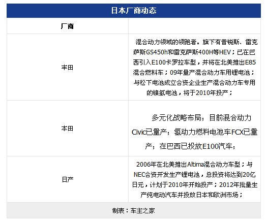 日本汽车厂商锂电池开发较早,且投入较大,多数由企业已与电池生产企业进行技术层面合作,在混合动力汽车和电力汽车领域处于领先地位。