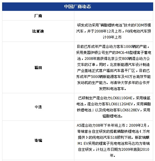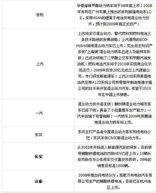 据统计,国内至少有30家客车企业已涉足新能源车研发;轿车方面,六大汽车集团以及奇瑞、吉利、比亚迪都争相研发新能源车,企业数量总计超过40家。但中国新能源汽车产量小,投入商业化生产的产品较少,政府产业发展规划和配套政策尚不明晰。2008年底首次出台了新能源车补助政策,即:将在13个城市开展节能与新能源汽车示范推广试点工作,并明确中央财政将对购置新能源汽车给予一次性补助。