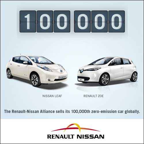 自推出电动车以来,雷诺-日产联盟的电动车销量已超过其他所有电动车制造商的总和。联盟推出的首款电动车是于2010年12月正式开始销售的日产聆风,它的首位车主是来自美国加利福尼亚州的硅谷工程师Olivier Chalouhi。而今年7月初,来自美国佐治亚州亚特兰大肯尼索州立大学的毕业生Allison Howard则因购买了日产聆风电动车,成为雷诺-日产联盟第10万辆电动车车主。