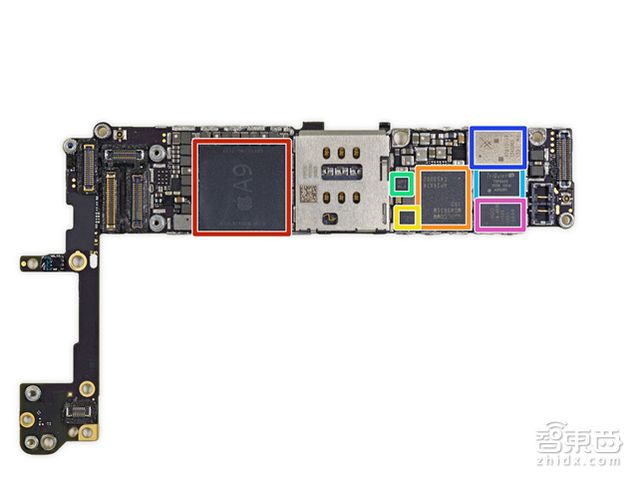 ① 红色部分:苹果全新的A9处理器及三星LPDDR4 2GB内存;