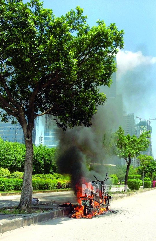 前日两车自燃造成的惊恐未消,昨日惠州又出现一起电动车自燃事故。昨日上午11时许,江北文化艺术中心旁惠州大道北行方向的辅道上冒出滚滚黑烟,一起骑行中的电动车发生自燃,烟柱达十多米高,10分钟左右被烧成铁架。