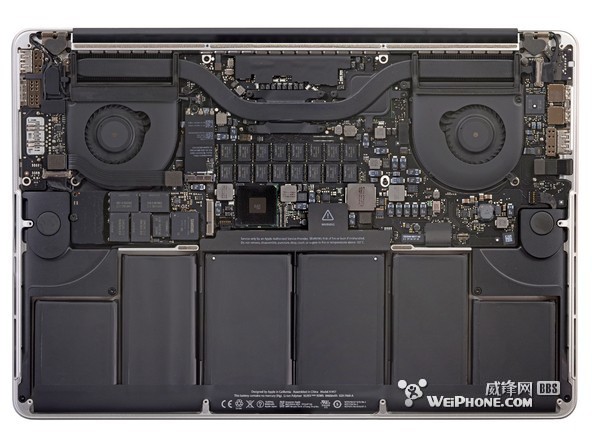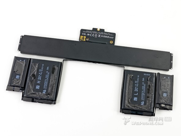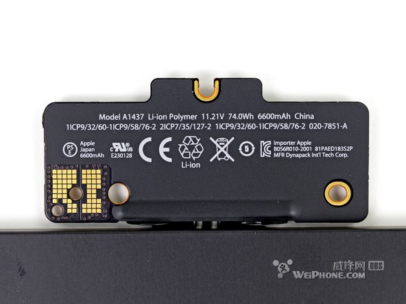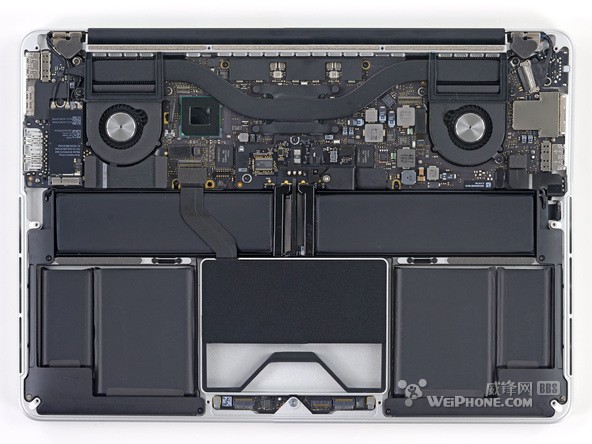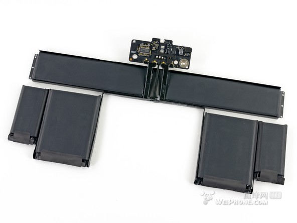 整块电池一共由 6 个电池单元组成,整体看上去就像一个衣架。和 15 英寸 Retina Macbook Pro 的电池设计相比,“衣架”风格的设计为 13 英寸 Retina Macbook Pro 的内部节省了许多空间。