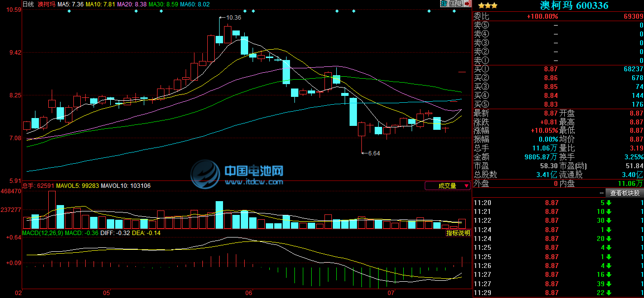今日澳柯玛开盘再度一字涨停,这已经是第二个一字涨停,股价报8.87元。