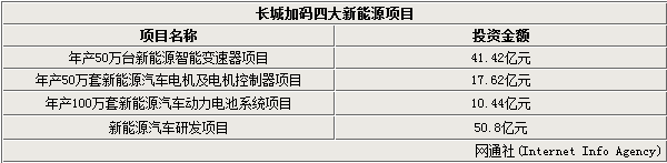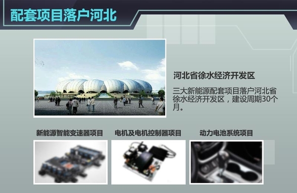 长城汽车除了强化新能源研发项目,新能源车的相关产业配套项目也已有所布局。“年产50万台新能源智能变速器项目”总投资41.42亿元,主演开展新能源智能变速器的研发、试验和生产;“年产50万套新能源汽车电机及电机控制器项目”总投资额17.62亿元;“年产100万套新能源汽车动力电池系统项目”总投资额为10.44亿元。该项目产品涵盖PHEV、EV、轻混、强混等四个子项目的配套动力电池系统(包括锂离子动力电池组件和电池管理系统)。这三个项目建设周期均为30个月,地点位于河北省徐水经济开发区。