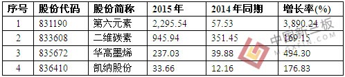 表1 石墨烯企业2014-2015年营收(万元)状况