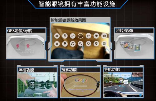 谷歌所开发的智能眼镜是基于Android操作系统运行的,理论上其不仅可以用语音操作、还 能采用视觉感应控制。在眼镜上会存在一个与佩戴者的视线同步的光标,并且可以与视线产生互动。这款眼镜集智能手机、GPS、相机于一身,具有收发短信、查 询天气路况等功能,与此同时在用户获取实时信息的同时,通过眨眼与视觉操作便可完成拍照、甚至上传一系列的操作。