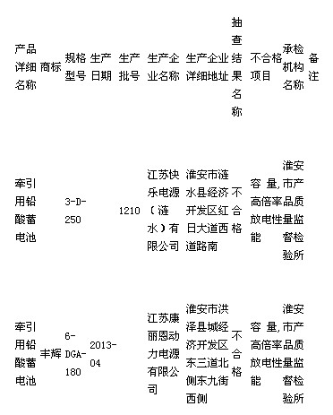 根据《中华人民共和国产品质量法》、《中华人民共和国政府信息公开条例》和《产品质量监督抽查管理办法》的规定,江苏省质量技术监督局对127类工业产品质量进行了省级监督检查。监测中发现,江苏快乐电源(涟水)有限公司的一批次3-D-250牵引用铅酸蓄电池(生产批号1210)、江苏康丽恩动力电源有限公司的一批次6-DGA-180丰辉牵引用铅酸蓄电池(生产日期2013-04),容量、高倍率放电性能项目不合格。