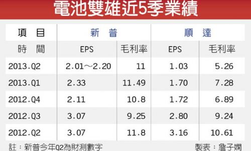 由于顺达下半年单颗电池芯占整体出货比重将突破5成,毛利率难以向上,而且大陆电池芯厂商受电池芯价格持续下滑,切入电池模块转为积极,台系模块厂杀价压力大。元大投顾预估,2013年顺达全年毛利率约6.2%,全年EPS为5.81元,比2012年的10.26元,接近腰斩。顺达第2季财报欠佳,单季每股税后盈余为1.03元,为金融海啸以来的新低,导致昨日股价重挫,一度被打入跌停,收77.8元,并拖累同业股价,加百裕(3323)盘中跌停,终场重挫5.81%,新普也跌掉半根停板,收125元。