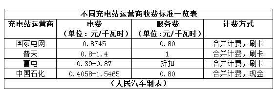 不同充电站运营商收费标准一览表