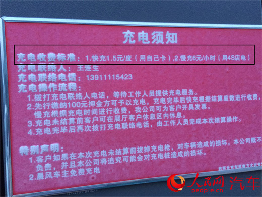 启辰北京东风南方大兴4S店充电桩上标示充电收费标准