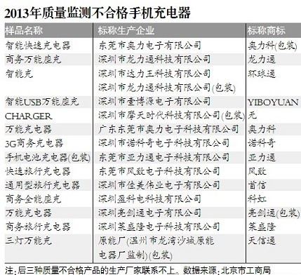 不合格充电器存在的问题是连接装置、抗电强度不合格。专家介绍,充电器抗电强度是考核充电器在通电工作时,其零部件及材料是否会出现漏电现象,是考核充电器安全性能的重要指标,该项不合格有可能会使人体发生触电,危及消费者人身安全。深圳市佳美伟业电子有限公司一款“首信”通用型旅行充电器、东莞市风致电子科技有限公司一款“风致”快速旅行充电器,都出现抗电强度不合格。