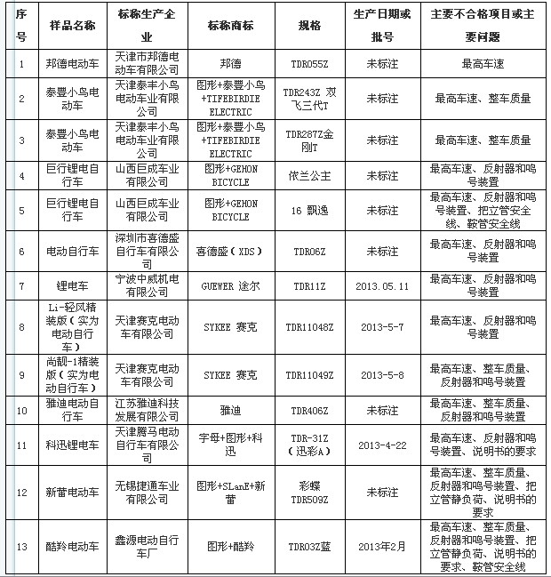 监测结果显示,邦德牌TDR055Z、泰豐小鸟牌TDR243Z 双飞三代T等13个型号总体判定为不合格,主要为最高车速、整车质量、反射器和鸣号装置、说明书的要求等项目不符合国家标准要求。具体名单如下: