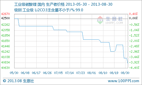 据生意社大宗榜监测数据显示,本月末工业级碳酸锂出厂均价40800元/吨,价格下行2.19%。本月中上旬碳酸锂价格一直较为平静,可下旬开始国内市场部分碳酸锂价格出现小幅下滑,但大多依旧维稳。
