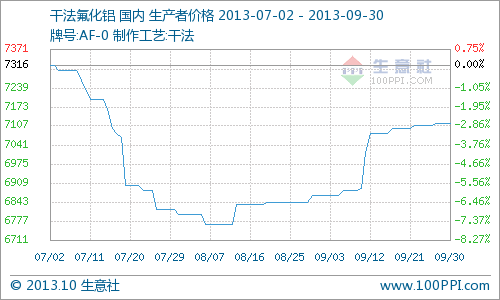 产品,9月份,经过氟化铝价格经过一轮上涨之后,氟化铝行业开工率逐渐增加到五成左右,供应稳定,库存稳定,由于价格的上涨很大程度上来源于行业助涨,走货量并未发生很大变化;