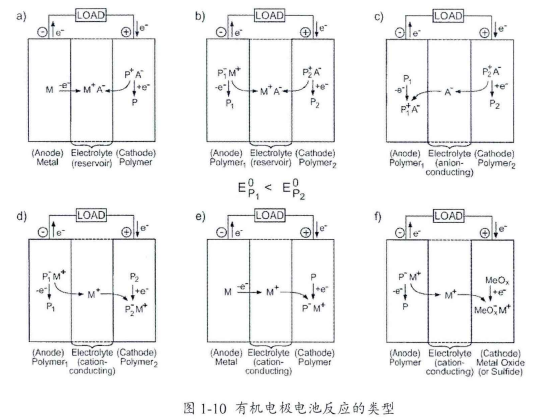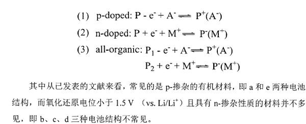 其中P1、P2为有机电极材料(可以是小分子也可以是聚合物),M+,A+为掺杂的正负离子,通常为Li+、Na+、(C4H9)4N+和Cl\ CICV、PF6-等。P1-M+,P2+A-、PI+A-、P2-M+为掺杂后的有机电极材料。