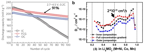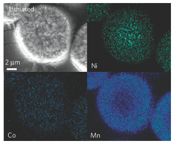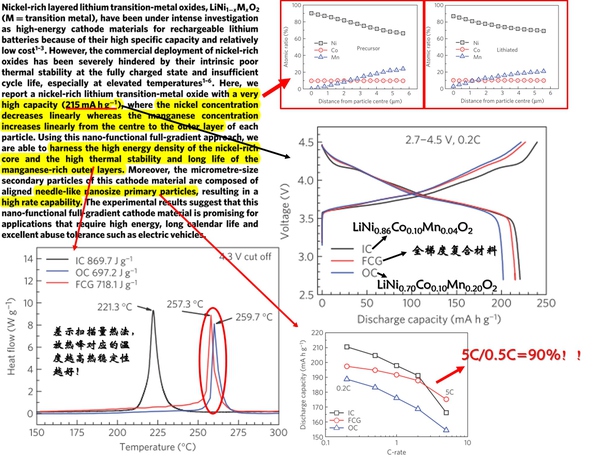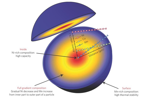 在这种梯度材料中,元素的含量由颗粒中心到外层呈现一种连续的梯度分布,保证了成分的均质。在这篇集合了五行三才之力的杰作中,Sun Yang-Kook发现了一种核心部分的富镍组成逐步过渡到外壳的富锰组成这么一种复合材料。