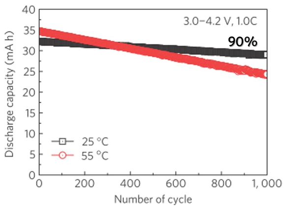 他们还做了全电池测试,用中间相碳微球作为负极,在1C的倍率下循环1000周,常温下的循环保持率有90%。