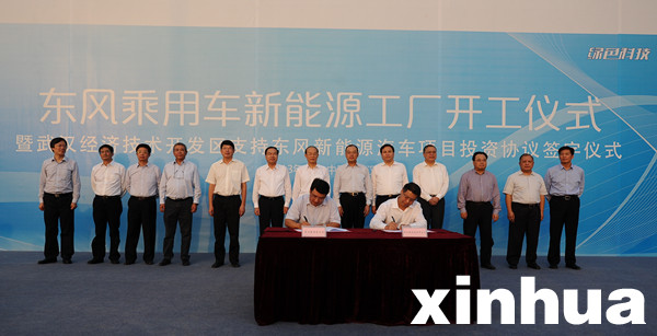 新华网武汉10月6日电(记者田建军)东风乘用车新能源工厂日前在武汉经济技术开发区破土动工,此举标志着武汉作为全国首批“十城千辆”工程示范城市和节能与新能源汽车示范推广试点城市,在转变经济发展方式、促进产业升级、加快“两型社会”建设方面又迈出了重要一步。开工仪式现场,武汉经济技术开发区签署了关于支持东风新能源汽车项目投资的协议。