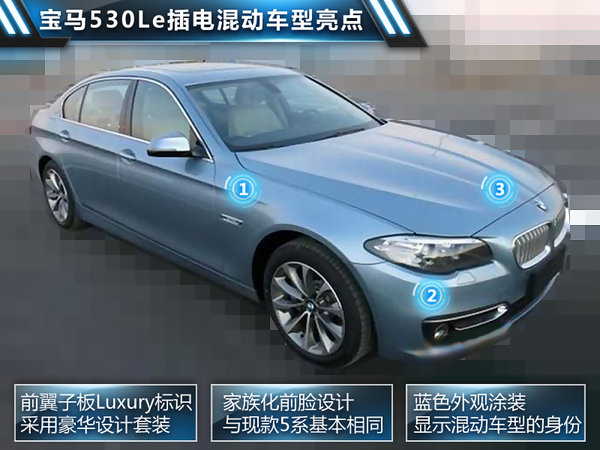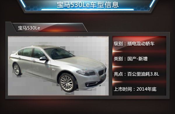宝马5系插电混动版的原型车此前在上海首发,代表着其在新能源领域的最新研发成果。宝马集团负责企业财务的董事艾希纳博士表示:5系混合动力车型将成为宝马在华的首款插电混动产品,帮助我们进一步拓展国内C级豪华新能源轿车的细分市场。新车型将定名为“530Le”,与现款车型相比将大幅节约油耗,降低至3.8L/100km。此外,网通社走访多家宝马4S店后获悉:宝马530Le预计将在2014年内实现国产。