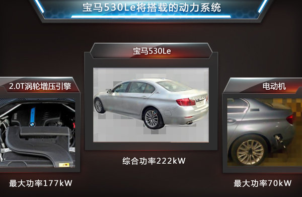 动力方面,国产华晨宝马530Le插电混动车型将搭载与X5 eDrive相同的动力总成,其由一台2.0升涡轮增压发动机和一台电动机组合。前者最大功率177kW,后者最大功率70kW,两者综合最大功率222kW,与之匹配的是8速手自一体变速箱。这款车的百公里综合油耗仅为3.8L。纯电动模式驱动时,其续航里程达到30km,最高时速达到120Km/h。