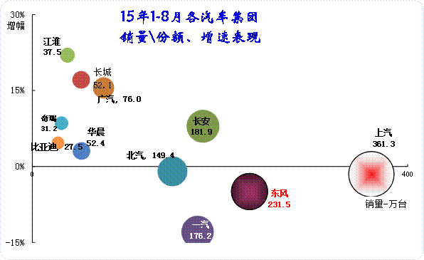 15年1-8月的大集团走势分化严重,一汽和东风严重的负增长,而长安和广汽表现较好。中小集团中只有华晨表现稍差。一汽和东风等大集团因为商用车的比重较大,经济下滑影响卡车表现,因此表现稍差可以理解。