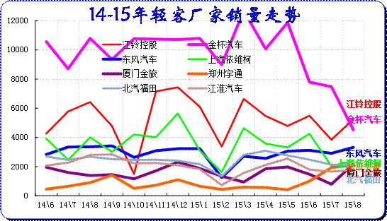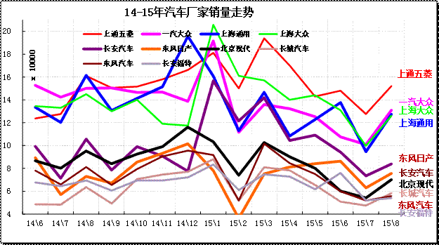 厂家表现分化,15年南北大众和通用三强中都强力降低批发,降低经销商的库存压力,因此8月批发走势下降。日系冲刺很猛表现突出。长安冲刺较猛,长安福特表现较强,长安系总体超常规增长。
