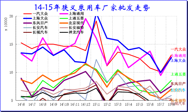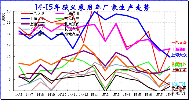 15年8月的厂家产销竞争仍是较激烈的,走势差异性大,主力厂家全面回调。三强的主力厂家的一汽大众和上海通用的产量调整较大;日系的生产增量较强,形成强力增产增库存的现象。