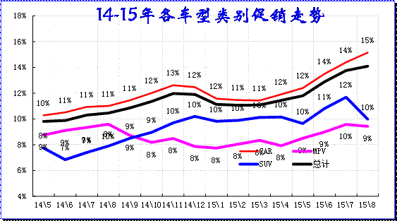 从各车型类别的促销走势看,在14年3-12月总体促销幅度逐步增大。15年的1-2月的收缩力度幅度较小,随后4-8月轿车促销增大较多。MPV大类车型的促销增长较平稳。SUV的促销力度2-4月加大,5月因新款降价稍有走稳,6-8月的SUV促销迅速加大。