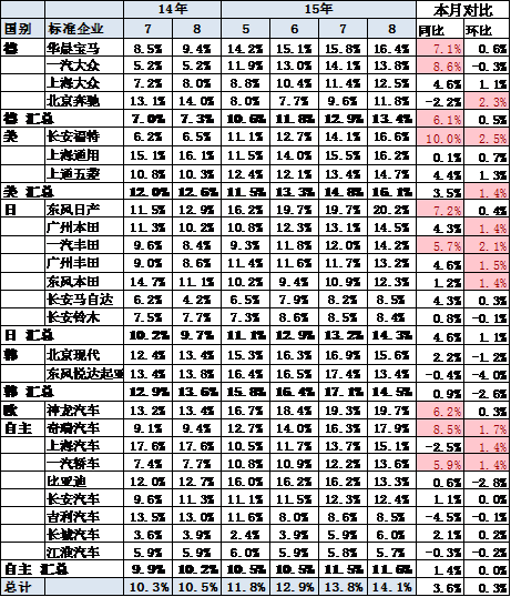15年8月的车市受到大众和通用的同比下滑而其他车系表现较强。近期日系份额明显回升,本田和丰田等份额表现较强,福特表现一般。自主上升走势也减弱。