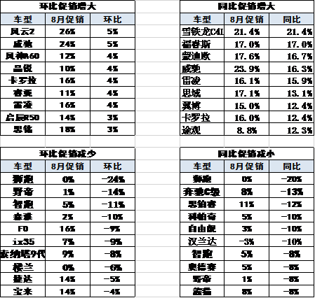 今年8月的主力车型促销力度增加较大,其中的日系的车型的促销的增加较多,自主品牌也有个别车型促销增大较多。