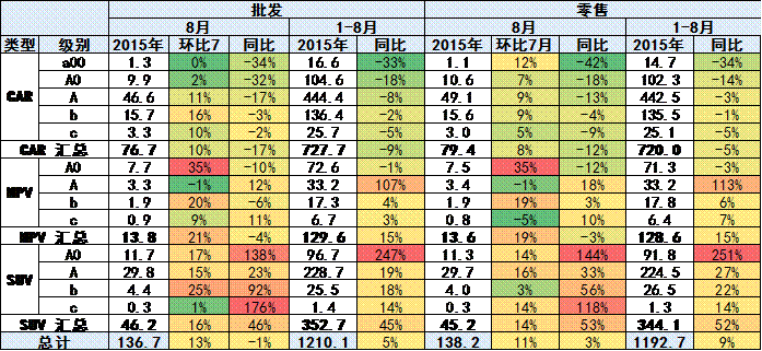 8月的狭义乘用车零售走势较强主要是A0级SUV车的同比增长带来的增量。而B级和C级SUV的增长也有改善的趋势。