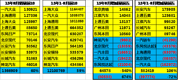 15年8月的前10位主力车企的销量贡献度达到60%,强于15年的1-8月的主力车企表现。15年8月的前5位增量主力车企的增量异常突出,其中自主品牌的主力车企在8月的销量排名较好, 长安汽车和江淮的表现都很不错。