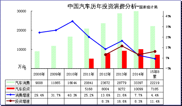2015年1-8月份,全国固定资产投资(不含农户)338977亿元,同比名义增长10.9%,增速比1-7月份回落0.3个百分点。第二产业中,工业投资137087亿元,同比增长8.7%,增速比1-7月份回落0.3个百分点;其中,采。1-8月汽车行业投资增长11.4%,放缓较大。