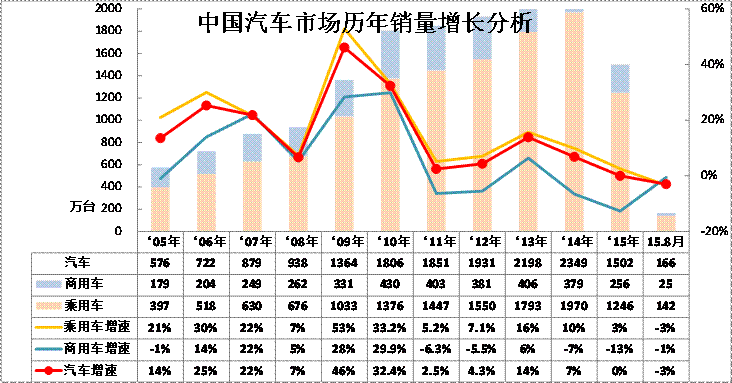 图表 1汽车05-2015年表现对比分析 单位 万台,%