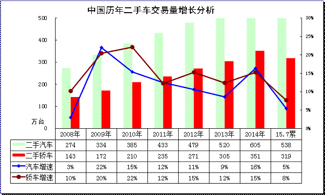 根据中国汽车流通协会数据,2015年1-7月全国二手车市场累计交易量537.95 万辆,相比上年同期增长5.42%,累计交易额3159.76亿元,相比上年同期上涨0.64% ;其中,7月当月交易量为77.05万辆,环比增长1.34%,月度同比增长3.43%;7月当月交易额为461.68亿元,环比增长3.14%。