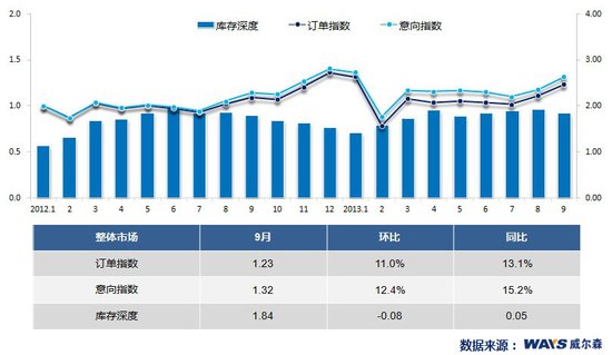踏入车市传统的销售旺季,9月消费者购车意愿增强,加上多地车展提振人气,经销商加大促销力度,整体市场意向、订单环比均大幅上升。厂家加大批发量,终端零售情况良好,库存快速消化,本月库存深度有所下降。